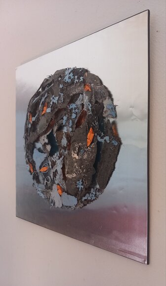 Resilience – 2025 – 30 x 30 cm – Mixed media (shaped aluminum, acrylic, hot glue, canvas, gesso) on etched copper sheet