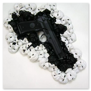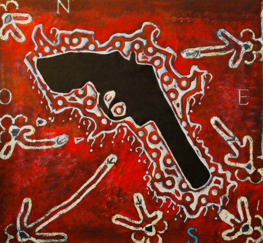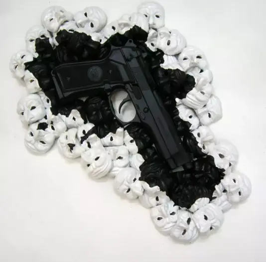 Scultura, tecnica mista, vernice, olio, acrilico e pistola giocattolo su tela e legno