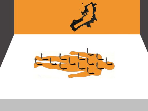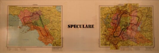 E’ un’analisi al microscopio della Campania e del territorio circostante: Il mare, l’entroterra, i territori confinanti. Ovunque sembrano esserci colonie di micro organismi misti a simboli di varia natura : punti cardinali, frecce direzionali, tamburi di pistola, fiori. Punti interrogativi determinano "lo spessore" della Campania.