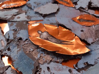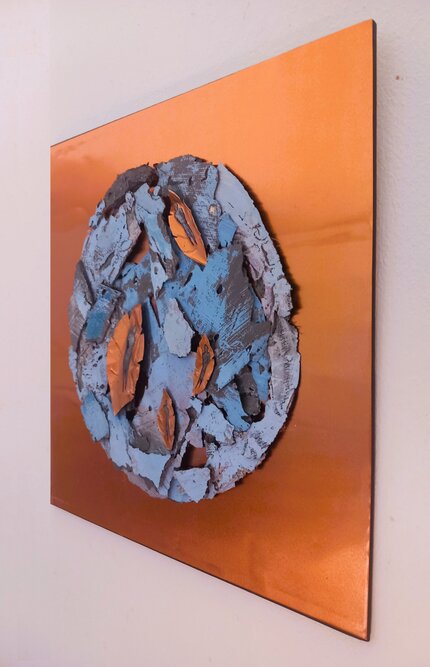 Resilience – 2025 – 30 x 30 cm – Mixed media (shaped aluminum, acrylic, hot glue, canvas, gesso) on etched copper sheet